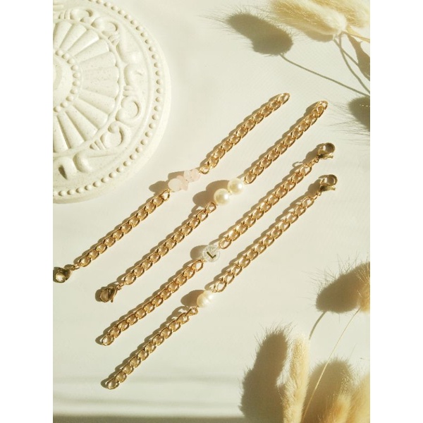 Ada beberapa varian pilihan • Rantai mutiara • Rantai doble pearls • Rantai batu alam soft rose quartz • Rantai inisial huruf