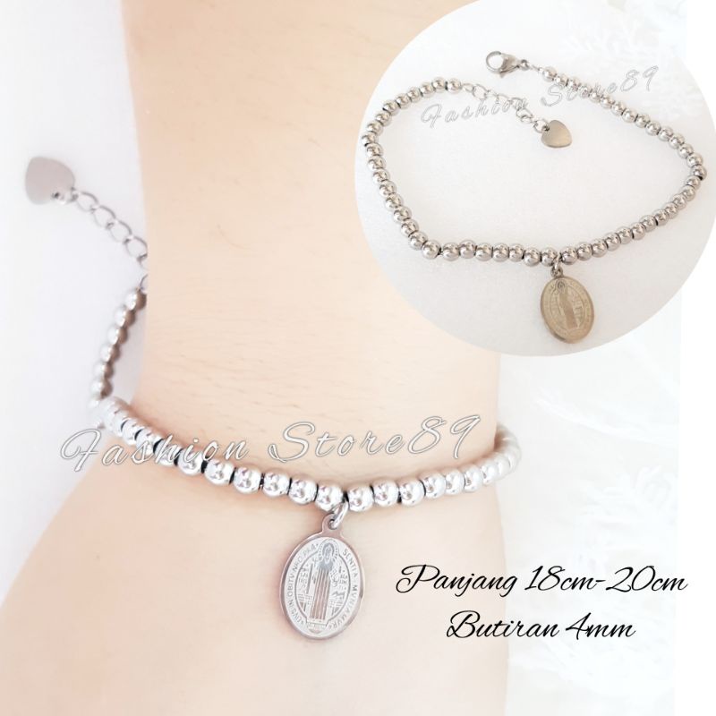 Detail Gelang Rosario Full Butiran 4mm Gold Silver Pria Wanita Fashion Rohani Bunda Maria & Santo Benediktus