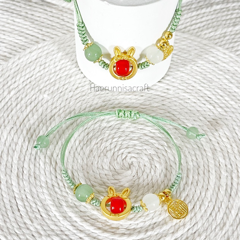 Detail Gelang Tali Kepang Design Liontin Kelinci Batu Giok Keberuntungan