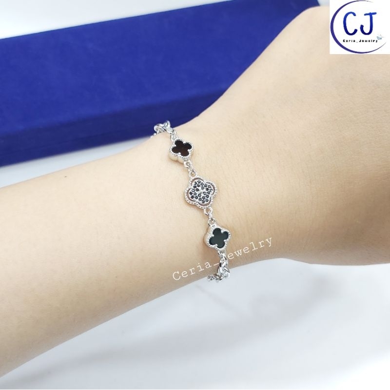 Gelang Tangan Wanita Perak Asli Silver 925 Lapis Emas Putih Model Rantai Ca'rtir Variasi VanCleef 3 Hitam - Perhiasan Perak Asli