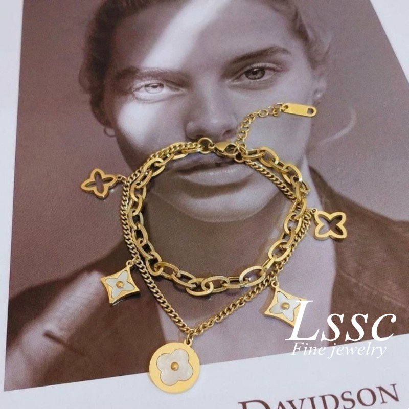 Detail Gelang Titanium 2 Layer Bunga Keberuntungan Emas 18K Wanita Anti Karat Perhiasan Fashion Korea
