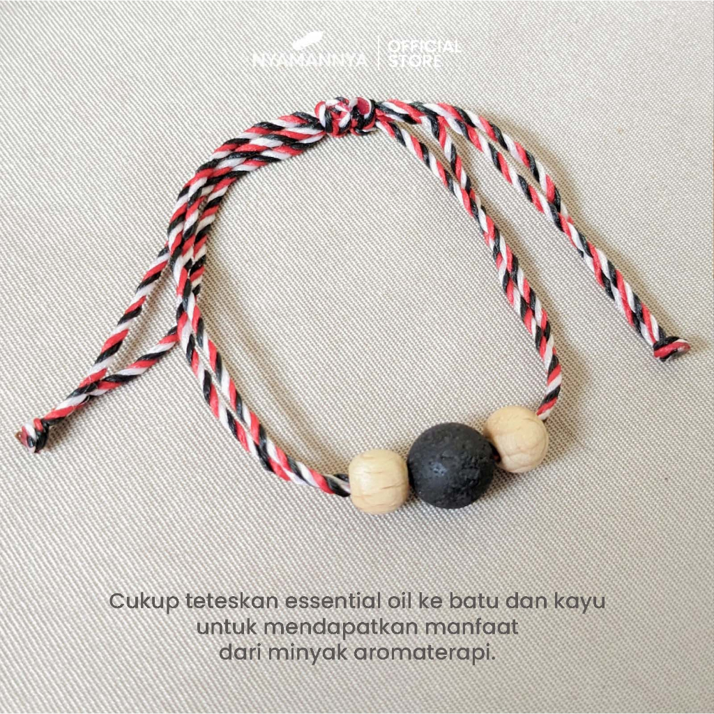 Gelang diffuser aromaterapi menggunakan tali tridatu dengan kayu natural yang dikombinasikan bersama batu lava, sehingga memiliki banyak manfaat, salah satunya dapat membantu memberikan ketenangan pada emosi.