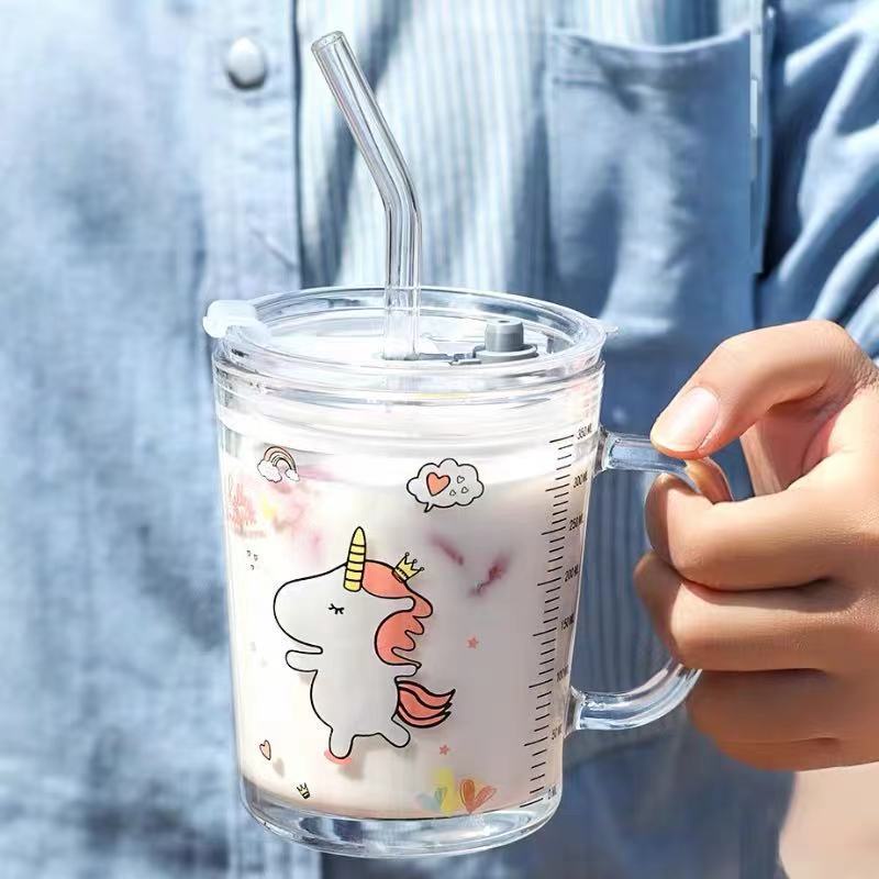 Perlengkapan Rumah > Peralatan Makan > Cangkir, Mug, & Gelas > Gelas Anak Motif Animal Kaca Bening dengan Gagang dan Tutup Anti Bocor 400ml MALLSHOPPING