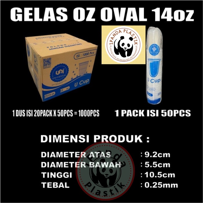 Gelas Oz Oval 14oz Dus 1000pcs Harga di atas untuk 50pcs per dus 1 pack isi = 50 pcs 1 Dus = 20 pack x 50 pcs = 1000 pcs