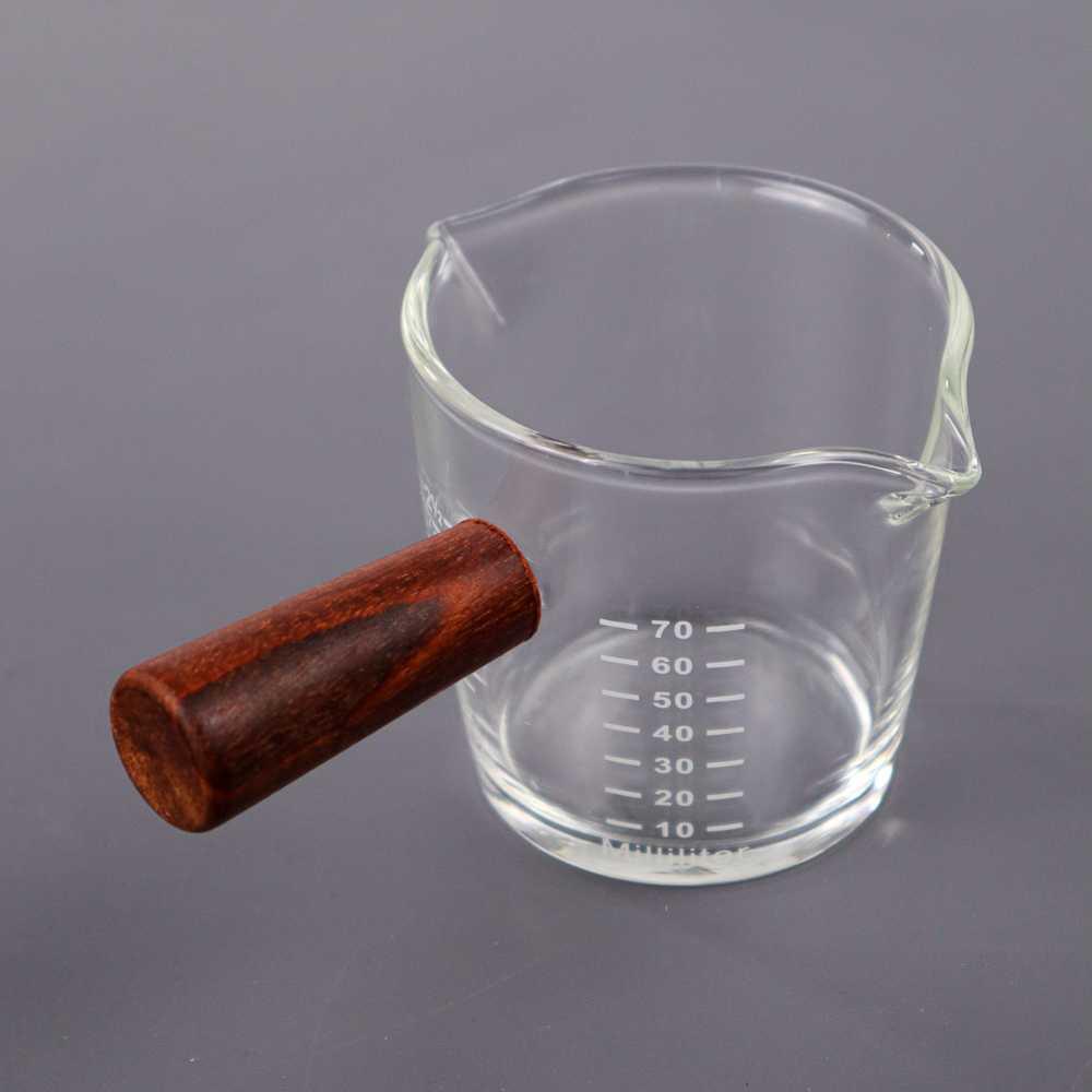 Spesifikasi One Two Cups Gelas Takar Espresso Measuring Cup Double Mouth - S08 Material : Kaca Borosilikat dan Kayu Dimensi : 70 ml: