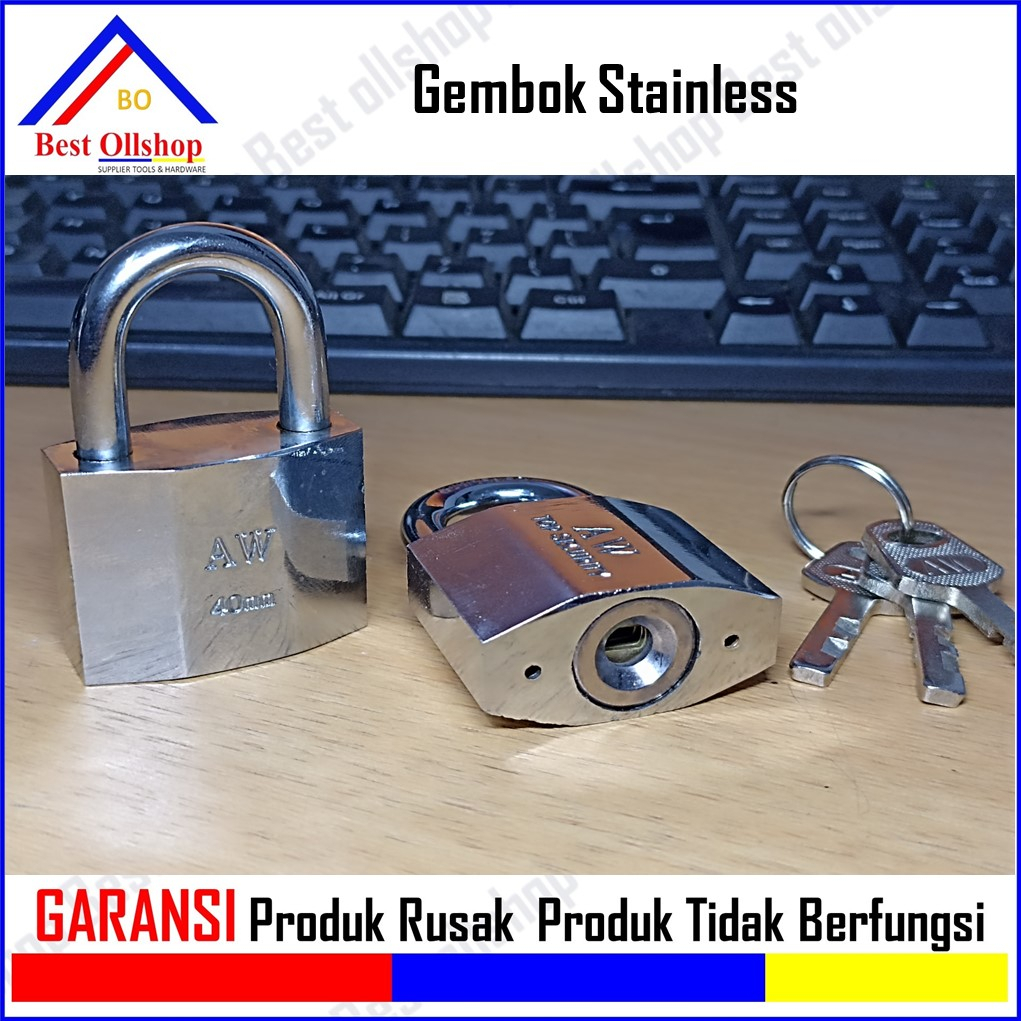 Deskripsi : - Gembok - Ukuran 40mm - Bahan Stainless - Jantung kuningan - Kunci cadangan 3 pcs Tersedia 2 model gembok