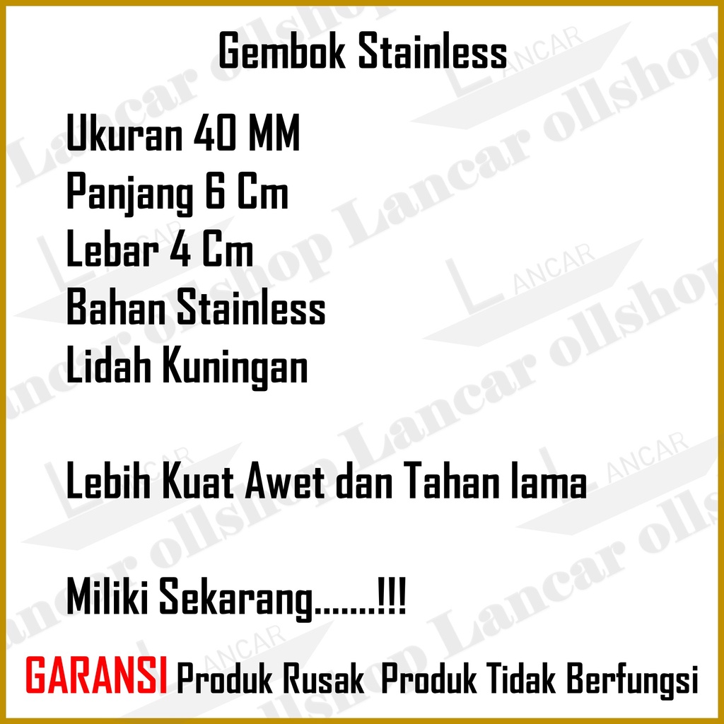 Deskripsi : - Gembok - Ukuran 40mm - Bahan Stainless - Jantung kuningan - Kunci cadangan 3 pcs Terdapat 2 model gembok