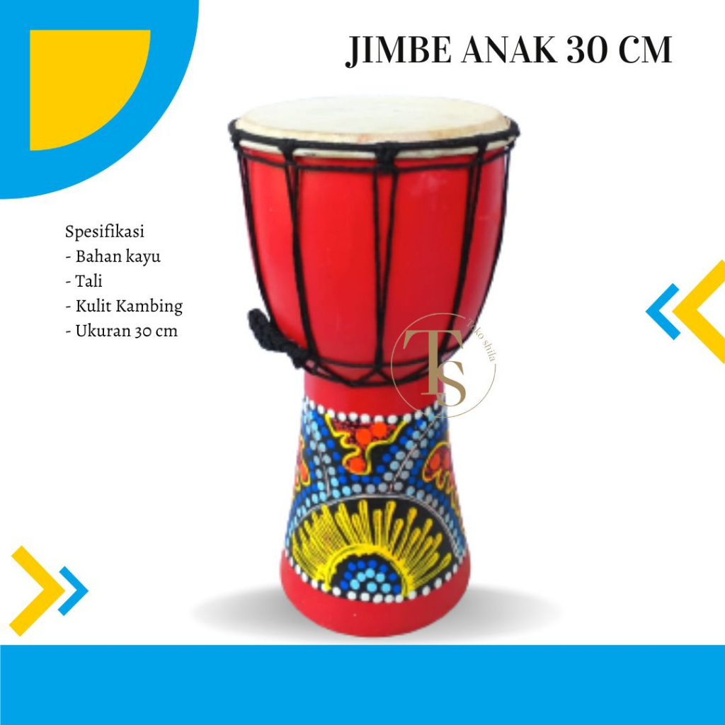 Jimbe anak ukuran 30 cm Spesifikasi - Bahan kayu - Tali - Kulit Kambing - ukuran tinggi kayu 30 cm - diameter kulit 14-15 cm
