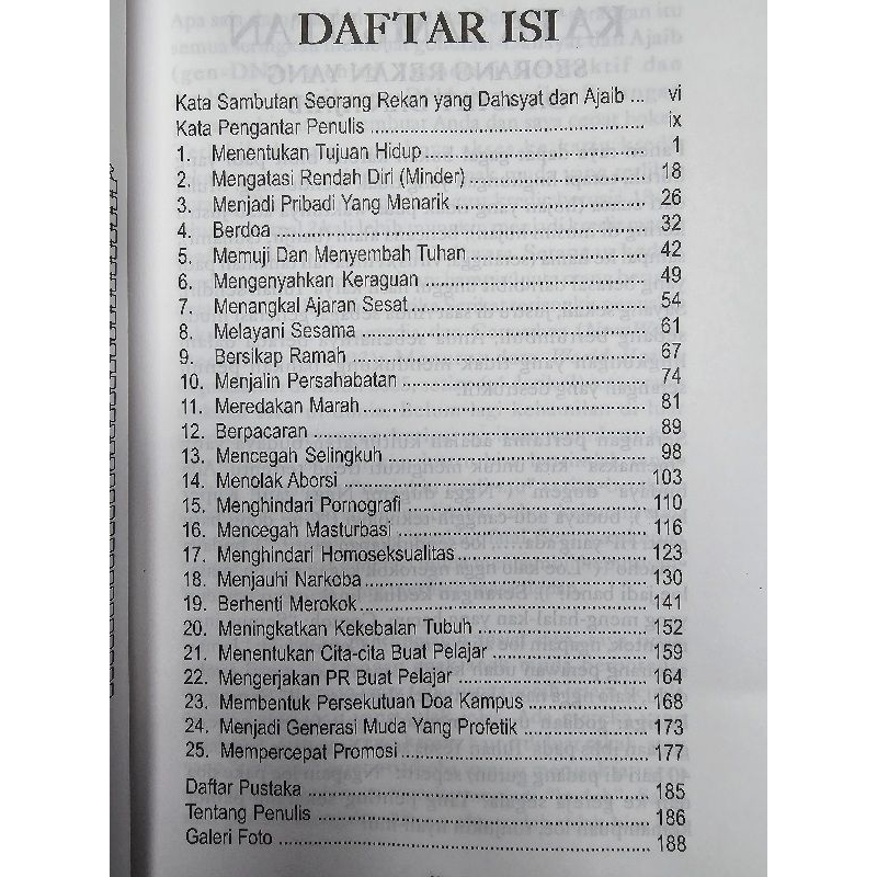 Inilah buku yang paling ditunggu-tunggu karena di dalamnya terdapat 25 tips-tips praktis yang pasti mengubah hidup Anda. Tips-tips ini bervariasi ulai dari tips menentukan tujuan hidup sampai tips mempercepat promosi, dari tips berdoa sampai tips menjauhi narkoba, dari tips memuji dan menyembah Tuhan sampai tips generasi muda yang profetik. dan masih banyak lagi.