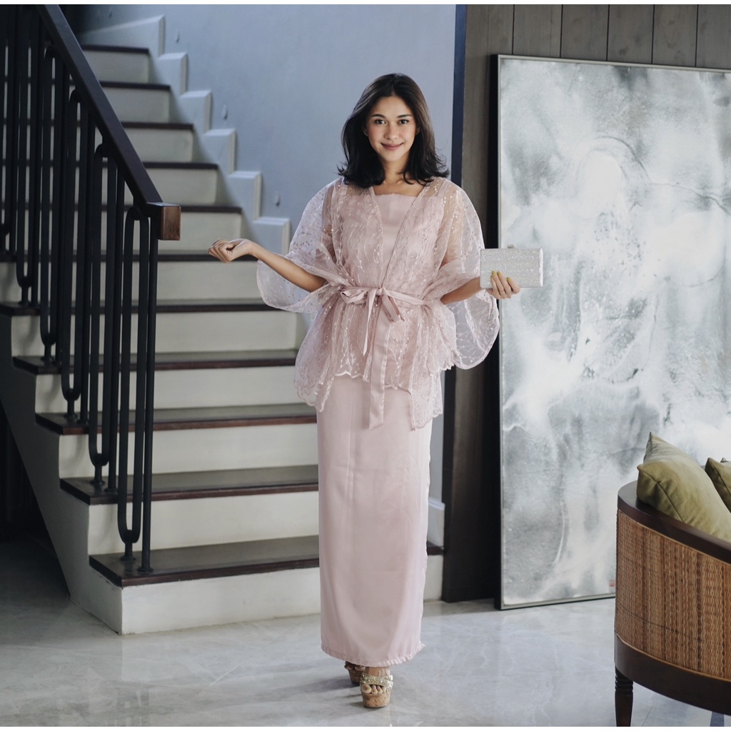 1 set outfit kondangan yg cantik terdiri dari: -tanktop satin velvet dengan potongan leher lurus dan karet belakang max lingkar dada 100 cm -kain ikat satin velvet ukuran 110 x 150 cm -outer kimono bahan tile bordir mutiara -obi pita satin velvet