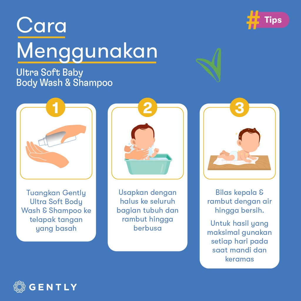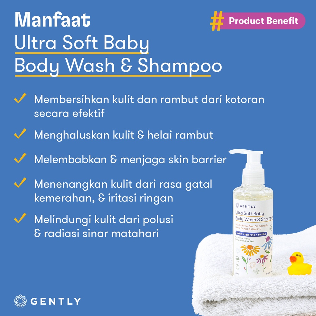 Ultra Soft Body Wash & Shampoo merupakan pembersih badan dan rambut dengan pH seimbang yang dapat membersihkan secara efektif tanpa SLS/SLES, diformulasikan dengan Sunflower Seed Oil dan Calendula Flower Extract yang dapat menenangkan kulit dari rasa gatal dan kemerahan. Gently Body Wash & Shampoo ini tidak akan membuat kulit kering, tidak perih dimata, dan memiliki wangi khas bayi yang lembut. Cocok dan aman digunakan untuk bayi baru lahir (newborn) hingga balita yang memiliki jenis kulit normal maupun kulit sensitf, kering, dan rentan gatal.