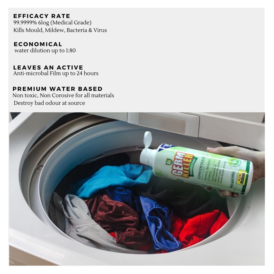 Campuran GK Concentrate bisa mencegah bakteri dan virus selama 24 jam, dan mehilangkan bakteri dan jamur penyebab bau. Selain itu, untuk GK Concentrate dilengkapi juga dengan natural citronella sehingga bisa menjauhkan nyamuk/serangga lainnya dari ruangan / benda-benda yang sudah di cuci dengan GK concentrate.