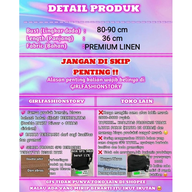 💜Jangan lupa untuk membaca deskripsi produk dan video produk karena Foto mungkin sama dengan toko lain tapi PRODUK Girlfashionstory diproduksi SENDIRI dan dijual langsung hanya di Girlfashionstory