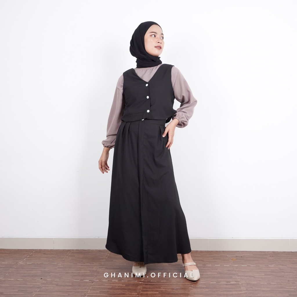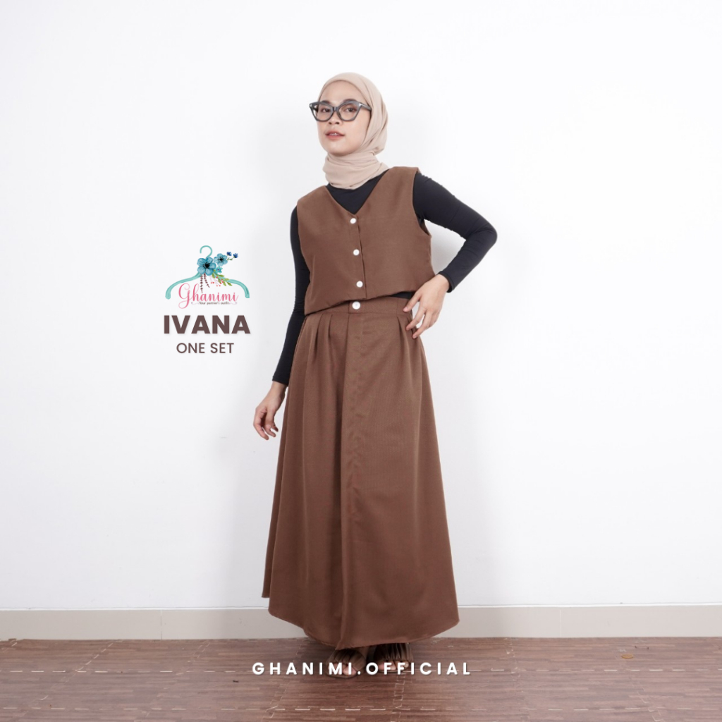 Ivana One Set ghanimi ini memiliki desain vintage yang terdiri dari vest dengan desain kerah v-neck juga dilengkapi 3 buah bukaan kancing di bagian depan. Untuk bagian roknya juga dilengkapi satu kancing dan cuttingan roknya A-line sehingga nyaman buat digunakan sehari-hari. Mengadopsi material Tory Burch yang adem dan juga lembut saat digunakan.