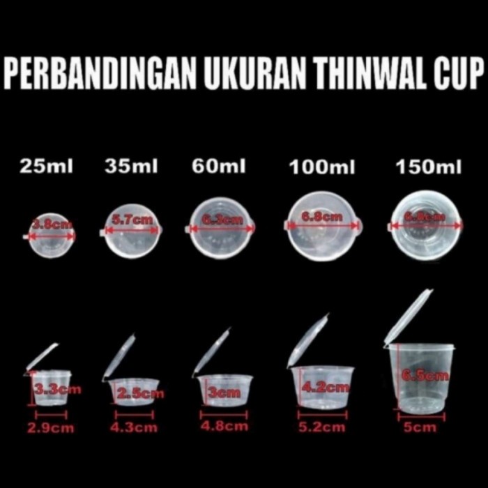 Spesifikasi : Thinwall cup saus sambal Bahan PP Foodgrade Ori Tahan Freezer kukus Microwave Diameter atas = 5.7 cm Tinggi = 2.5cm Tebal = 0.45mm Diameter bawah = 4.3 cm