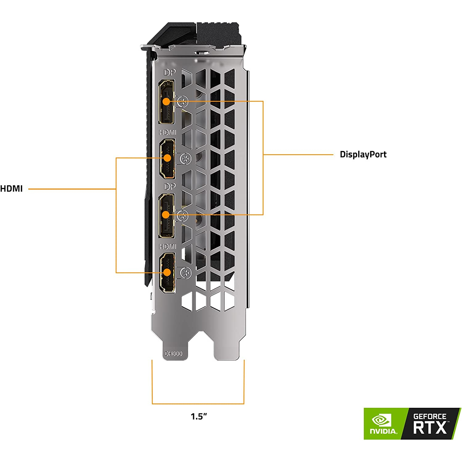 Graphics Processing GeForce RTX™ 3060 Core Clock 1792 MHz (Reference Card: 1777 MHz) CUDA® Cores 3584 Memory Clock 15000 MHz Memory Size 12 GB Memory Type GDDR6 Memory Bus 192 bit Memory Bandwidth (GB/sec) 360 GB/s Card Bus PCI-E 4.0 x 16 Digital max resolution 7680x4320 Multi-view 4 Card size L=198 W=121 H=39 mm PCB Form ATX DirectX 12 Ultimate OpenGL 4.6 Recommended PSU 550W Power Connectors 8 pin*1 Output DisplayPort 1.4a *2 HDMI 2.1 *2