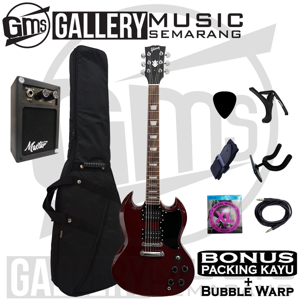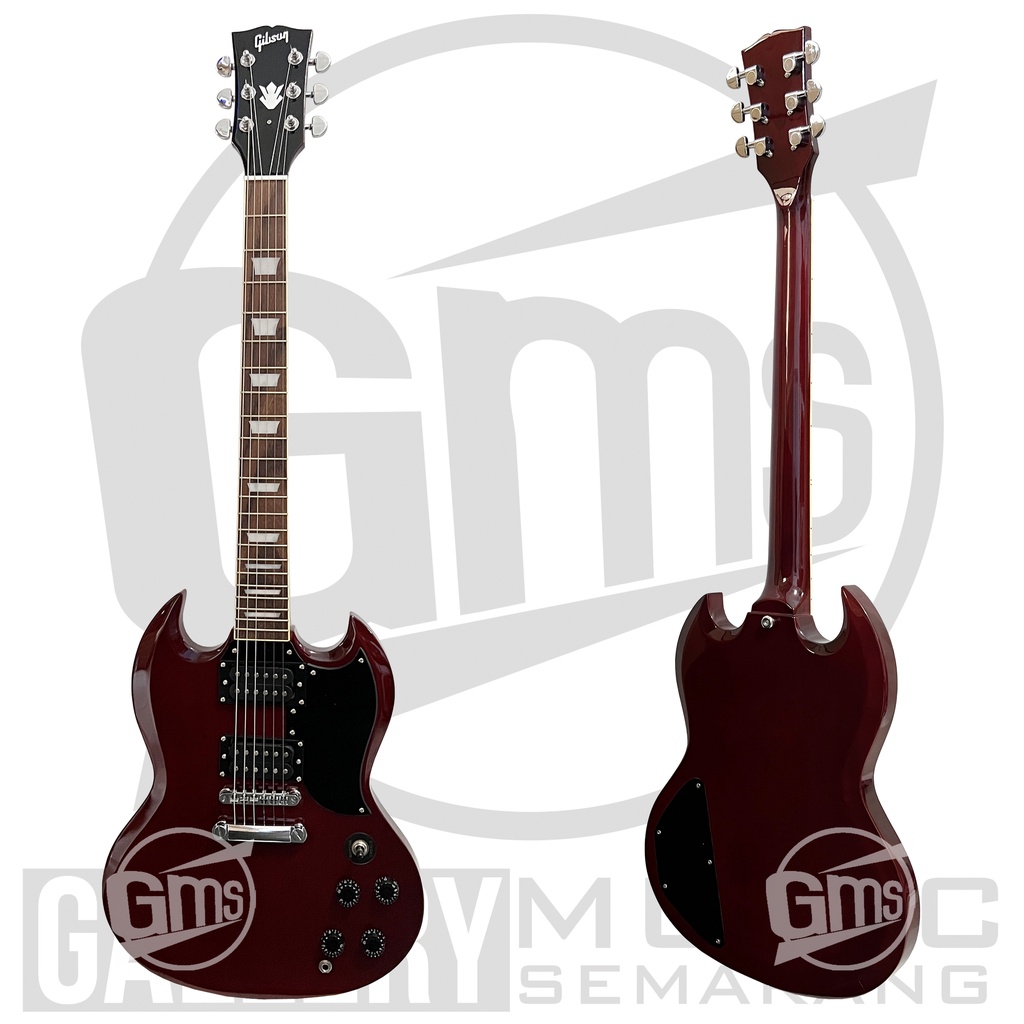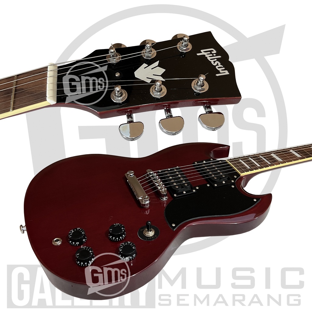 Spesifikasi : Body Mahogany Neck Mahogany Fingerboard Rosewood Tanam besi/trushroad bisa di setting double action List Kuning Gading Tuning Machine Dryer glover 22 Fret Double Pickup GnB Senar D'Addario Fret steel/baja tebal Tremolo Standart Gibson SG Playbility nyaman di tangan Jarak senar rendah sehingga nyaman dimainkan Suara terjamin mantap Finishing mulus
