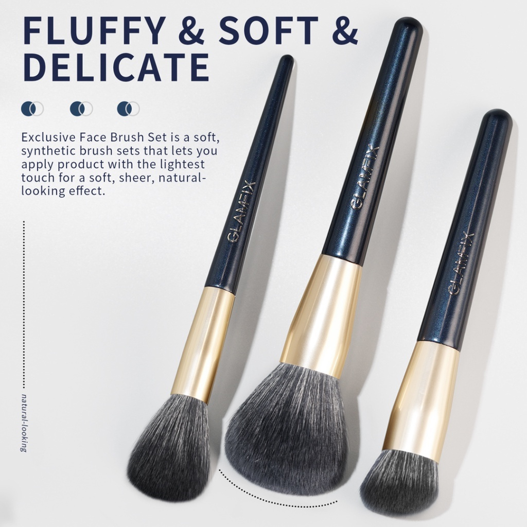 GLAMFIX Exclusive Face Brush Set terdiri dari 3 Pcs : 1. Powder Brush 2. Blush Brush 3. Concealer/Contour Brush