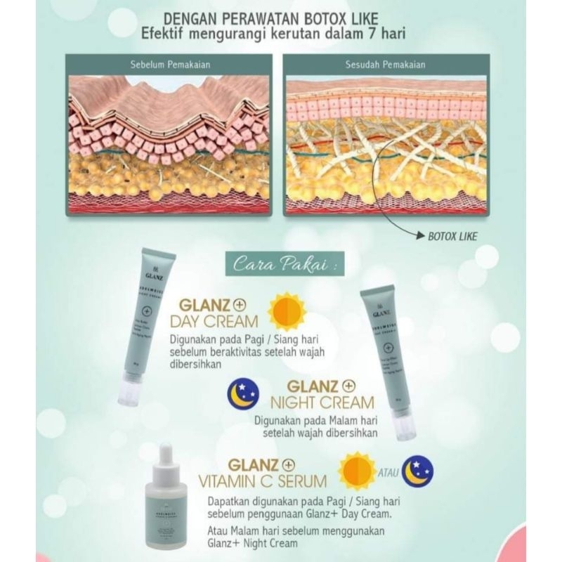 Detail GLANZ+ Skincare Series Extra Salmon Ovary Peptide Anti Aging Peptide Botox Like Peptide Paket Perawatan Wajah Day Cream Night Cream Vitamin C Serum Original KK Indonesia