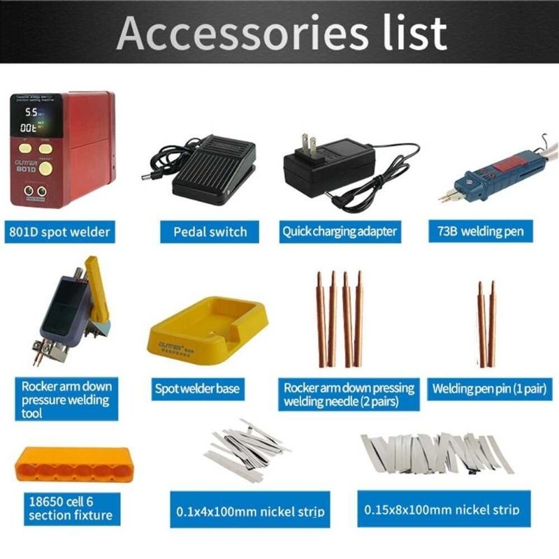 Kelengkapan Produk Rincian yang Anda dapatkan untuk pembelian produk ini: 1 x GLITTER Sunkko Mesin Las Pulse Spot Welding Machine 12KW 220V - 801D 1 x Pena Las 1 x Switch Pedal Kaki 1 x Adaptor Daya 3 A 1 x Lengan Mesin Las 1 x Dudukan Las 4 x Jarum Pin Lengan Mesin 2 x Jarum Pin Pena Las 50 x Lempengan Nikel (0.1x4x100 mm) 50 x Lempengan Nikel (0.15x8x100 mm) 1 x Panduan Penggunaan Spesifikasi GLITTER Sunkko Mesin Las Pulse Spot Welding Machine 12KW 220V - 801D Voltase Input: AC 10-240 V Output: 6 V Daya / Power 12000 KW Dimensi 67 x 176 x 126 mm Lain-lain Rated input current: 200 - 2500 A Energi Las: Hingga 238 J Mode Trigger: AT/MT Waktu Pengisian Daya Pen: Sekitar 30 menit Delay Preload: Sekitar 20-50 ms