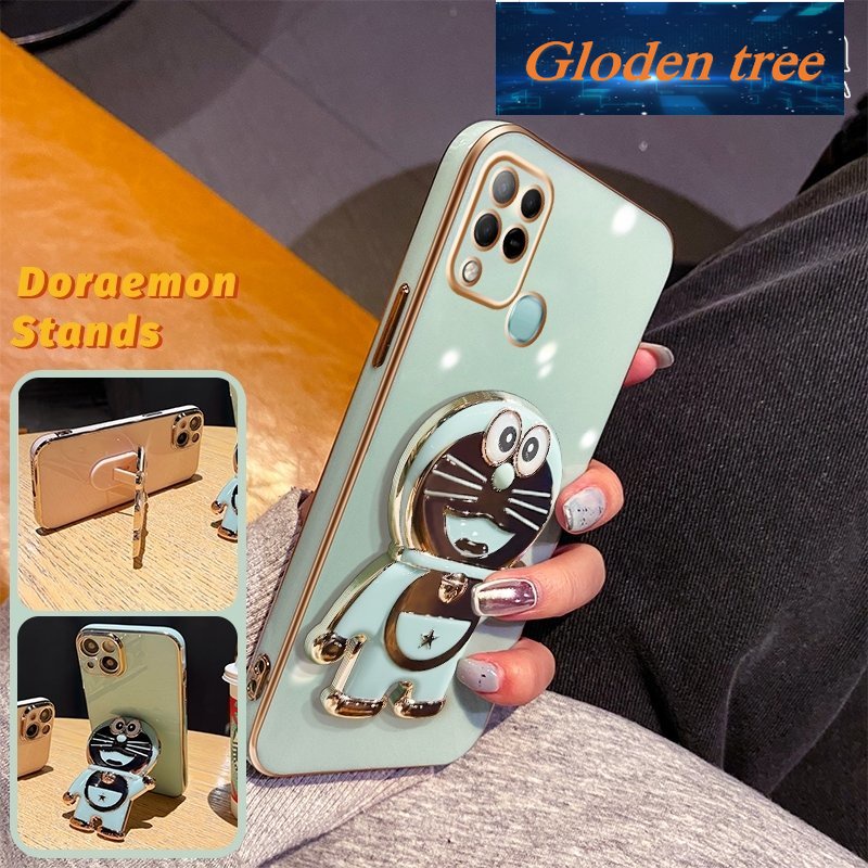 Handphone & Aksesoris > Casing & Skin > Casing & Skin Handphone > Gloden tree Casing Untuk Infinix Hot 10s NFC Hot 10T Case Fashion Kartun Doraemon Lipat Stand Phone Case Electroplating Shockproof Phone Holder Case