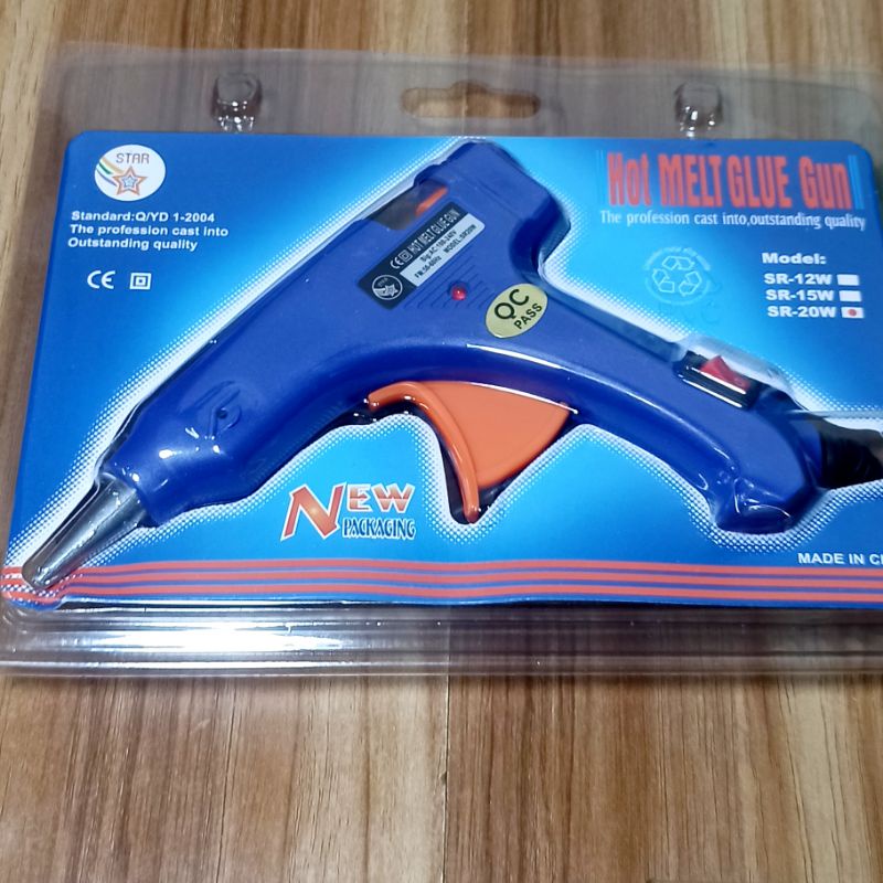 Tegangan : 220V/50Hz Daya : 20 Watt Waktu persiapan penggunaan : 2 - 5 menit Aliran lem : 6 - 8 g/menit Sudah termasuk isi ulang lem tembak 10 batang, jadi bisa langsung digunakan. Digunakan untuk : kertas, plastik, keramik, kayu, dll.