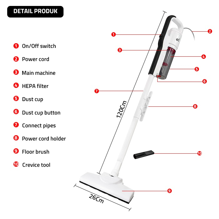 - Hisapan kuat dengan 2 filter HEPA - Kabel panjang mudah digunakan tanpa perlu kabel rol - 2 mode kepala hisap - Kabel holder - 2 in 1 dapat digenggam dan digunakan vertikal - Tahan lama dan dapat dibersihkan berulang kali