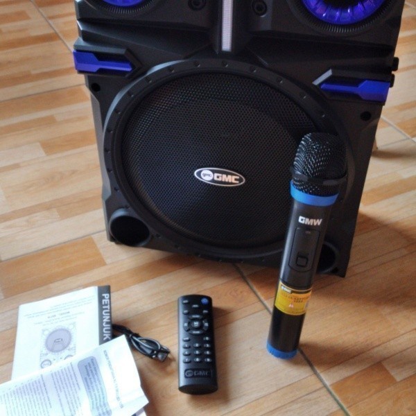 Kelengkapan 1 unit speaker GMC 897R 8 Inch 1 Unit Mic Wireless 1 unit kabel Charger 1 unit Remot control 1 pcs buku dan Buku Garansi