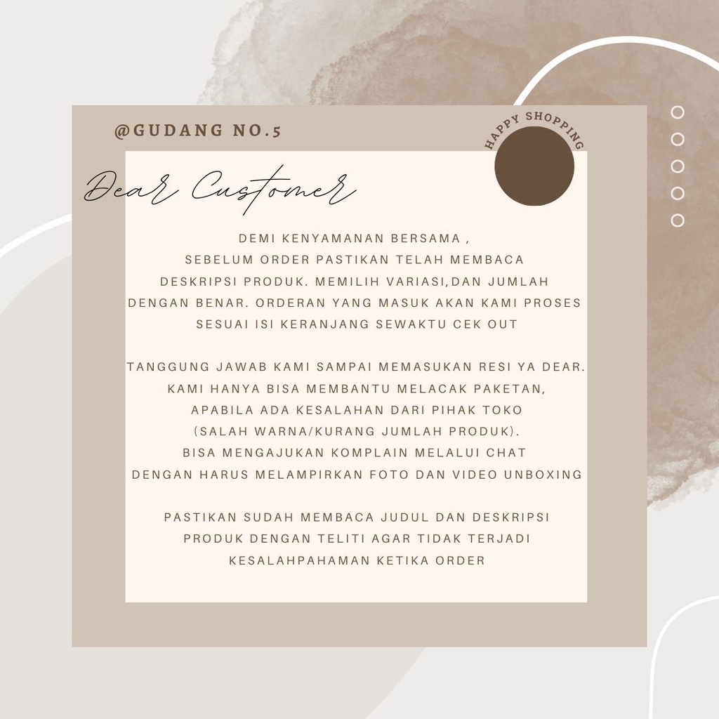 ♥ Mohon cek barang langsung setelah barang sampai. Komplain kami terima 1x24 jam setelah barang sampai.. Kami cek berdasarkan tanggal dan jam di resi pengiriman. Tidak menerima alasan apapun kalau sudah komplain di luar 1x24 jam. ♥ Untuk komplain wajib melampirkan foto produk yang rijeknya, kertas invoice di packingan dan foto kode team peacking kami . ♥ Kerusakkan barang : ada keputusan diskon, retur dll. Akan dicek dulu kasusnya. Tentunya kami akan memberikan solusi terbaik buat Customer kami 🌸🌸 ♥ Kalau dropsip tuliskan nama DROPSHIP di fitur dropship pada saat cek out