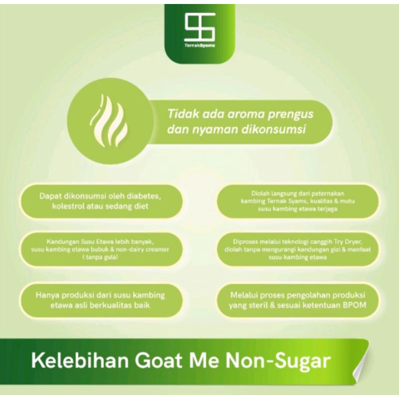 Kelebihan Goat Me Non Sugar Susu Kambing Etawa Bubuk Ternak Syams : 1. Tidak ada aroma prengus, nyaman di konsumsi. 2. Dapat dikonsumsi oleh diabetes, kolestrol atau sedang diet. 3. Dengan kandungan Susu Etawa yang lebih banyak, Susu kambing etawa bubuk dan non dairy creamer (tanpa gula) 4. Hanya produksi dari susu kambing etawa asli yang berkualitas baik, kami cek selalu kualitasnya. 5. Di olah langsung dari peternakan kambing Ternak Syams, kualitas dan mutu susu kambing etawa terjaga. 6. Di proses melalui teknologi canggih Try Dryer, di olah tanpa mengurangi kandungan gizi dan manfaat susu kambing etawa. Susu Kambing Etawa Ternak Syams akan lebih terasa manfaat dan khasiat nya. 7. Melalui proses pengolahan produksi yang steril dan sesuai dengan ketentuan BPOM. 8. Kualitas dan mutu produk susu kambing etawa bubuk selalu di perhatikan dan di kembangkan, kami berikan yang terbaik agar customer mendapatkan produk berkualitas terbaik. 9. Mengutamakan Kepuasan Pelanggan, karna Kepuasan Anda adalah Tanggung Jawab kami.