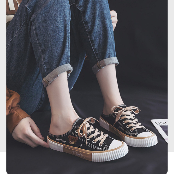 Detail Gobra ♕ SEP030 (Tanpa Kotak) Sepatu Sneakers Wanita Setengah Why Bear Kanvas Putih Sporty Model Korea Fashion Casual Sport Olahraga Import COD