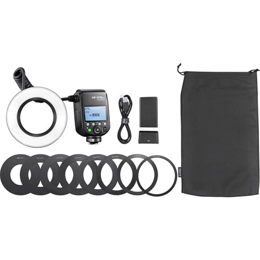 What's in the box? Godox MF-R76S TTL Macro Ring Flash for Sony 49mm Adapter Ring 52mm Adapter Ring 55mm Adapter Ring 58mm Adapter Ring 62mm Adapter Ring 67mm Adapter Ring 72mm Adapter Ring 77mm Adapter Ring Lithium Battery USB Charger USB-C Charging Cable Storage Bag