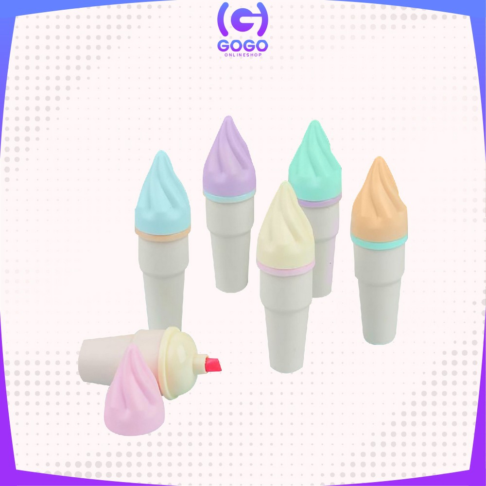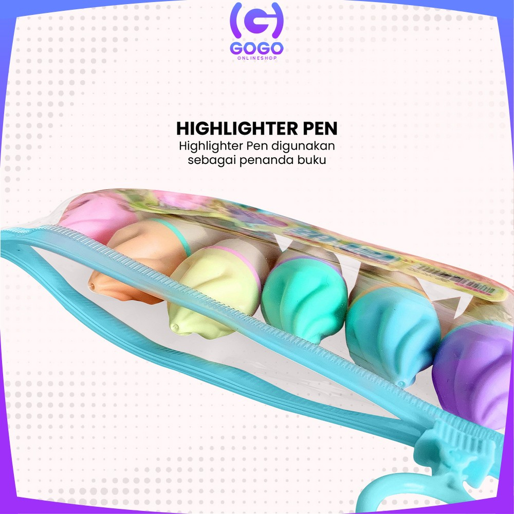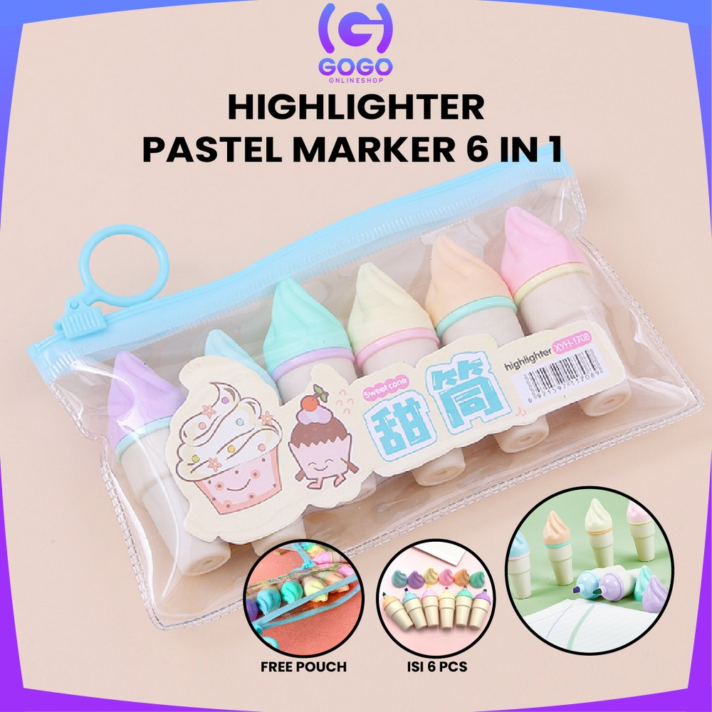GOGO-A57 Highlighter Pen Es Krim Cone Monas 6 in 1 Free Pouch Penanda Berwarna / Spidol Highlighter Model Ice Cream Cone Unik Alat Tulis kantor Stationery