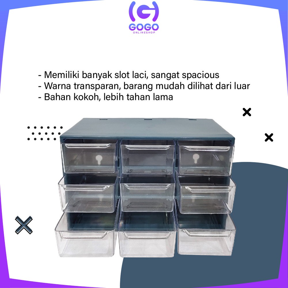 Deskripsi Produk: Rak Laci kotak mini ini memiliki 9 sekat yang dapat anda gunakan untuk menyimpan aksesoris, perhiasan, alat menjahit, stationary, bibit tanaman, organizer stationary dan lainnya sesuai dengan keinginan anda.
