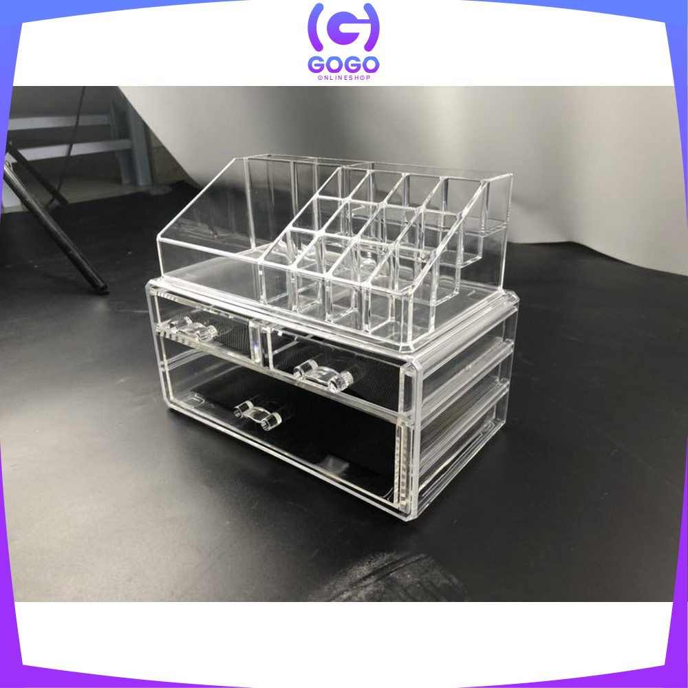 Perlengkapan Rumah > Furniture > Rak & Rak Gantung > GOGO-K16 Kotak Make Up Acrylic + 3 Laci Rak Kosmetik Organizer / Rak Serbaguna / Storage Box Cosmetic