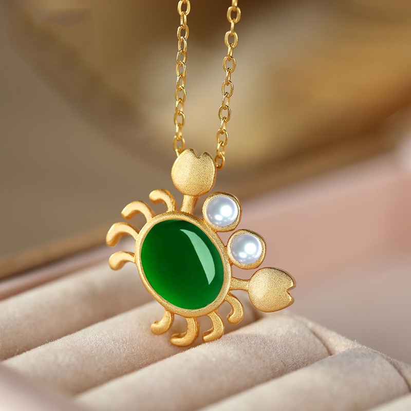Aksesoris Fashion > Aksesoris Tambahan > Liontin > Goldkingdom Aksesoris Perhiasan Fashion Ready Stock Kerajinan Emas Tua Kepiting Kecil Kalung Giok Putih chrysoprase crab pendant pearl