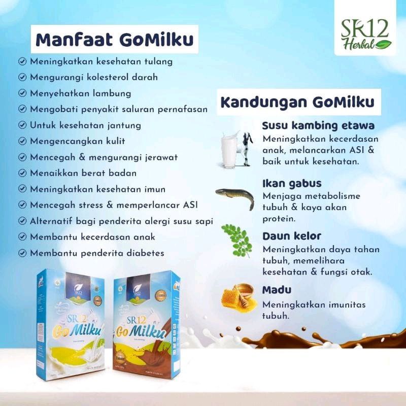 8. Udah pake gula? tidak pakai gula, karena GoMilku merupakan susu kambing murni yang diproses dan di Filling menjadi susu bubuk 9. Takaran Untuk membuat Susu (Dewasa) 2 Sendok Makan dengan 200ml Air, (Anak Dibawah Usia 12 Tahun 2 Sendok teh setara 200 ml Air 10. Manfaat Susu Etawa GoMilku SR12 • Meningkatkan Kesehatan tulang • Mengurangi Kolesterol darah • Menyehatkan Lambung • Mengobati Penyakit saluran Pernafasan • Untuk Kesehatan Jantung • Mengencangkan Kulit • Mencegah dan Mengurangi Jerawat • Menaikan Berat badan • Meningkatkan Kesehatan Imun • Mencegah Stress • Memperlancar ASI • Alternatif bagi penderita alergi susu sapi • Membantu Kecerdasan Anak • Membantu Penderita Diabetes