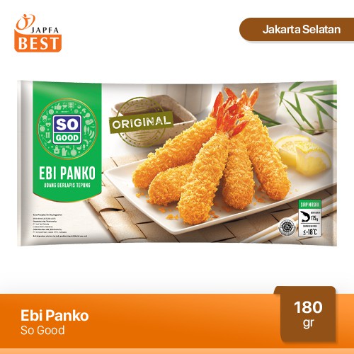 So Good Ebi Panko terbuat dari udang segar utuh berbalut breadcrumb yang renyah, menghadirkan cita rasa udang yang begitu khas. So Good Ebi Panko bisa disajikan sebagai menu bento, topping ramen, ataupun sebagai camilan sehat. Selalu ada alasan untuk menikmati sajian So Good Ebi Panko yang lezat, praktis dan kaya protein. - Berat: 180 gr