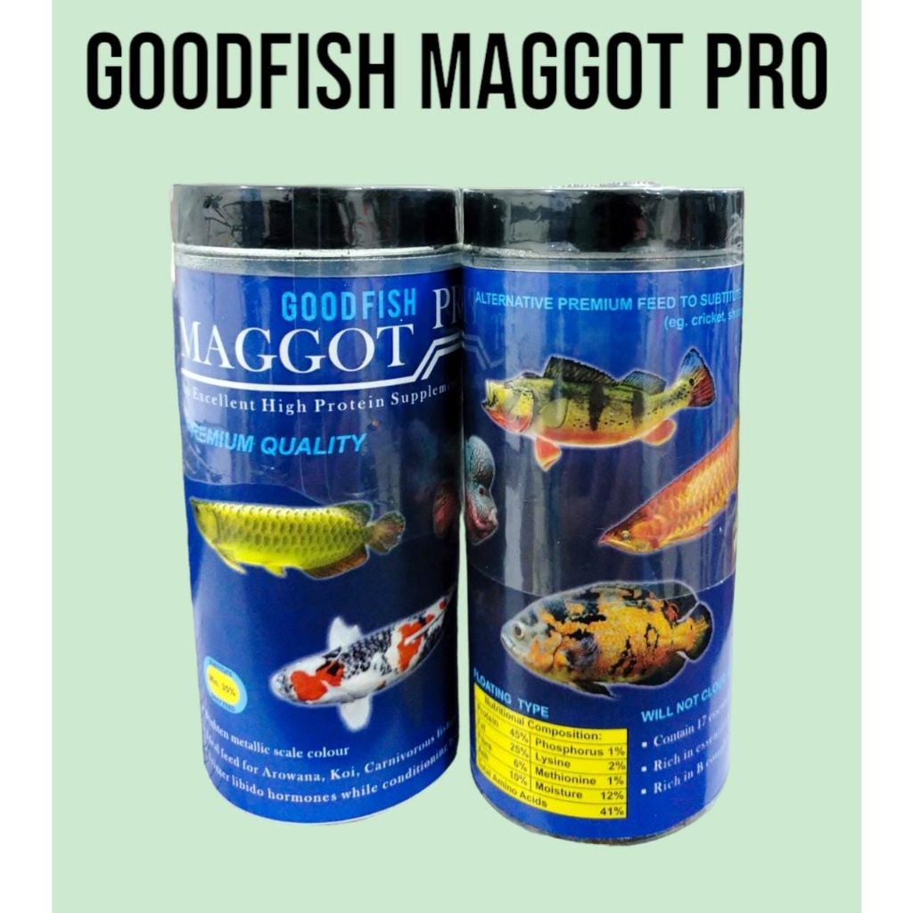 Pakan GOOD FISH MAGGOT PRO adalah pakan untuk arwana, koi, louhan dan segala jenis ikan predator yang sangat bergantung pada pakan hidup. GOOD FISH MAGGOT PRO berperan sebagai pakan alternatif / substitusi untuk arwana / predator yang menu utamanya adalah ikan hidup, udang, jangkrik, ulat, kodok dan kelabang.