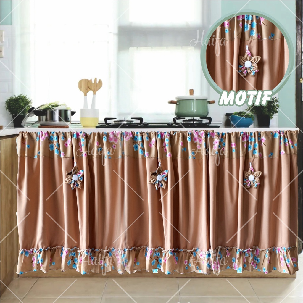 MATERIAL Terbuat dari bahan katun polimikro polos dengan variasi katun polimikro bercorak bunga ditambah aksesoris bunga gantung handmade menambah tampilan shabby untuk dapur bunda2. tersedia dalam berbagai ukuran : L 100 cm X T 55 cm L 100 cm X T 65 cm L 100 cm X T 75 cm L 100 cm X T 85 cm Untuk kolong dapur ukuran panjang 100 cm bagusnya memakai 2 helai gorden agar hasilnya bergelombang ketika dipasang Silahkan chat admin jika ada yang ingin ditanyakan. KAWAT DIJUAL TERPISAH