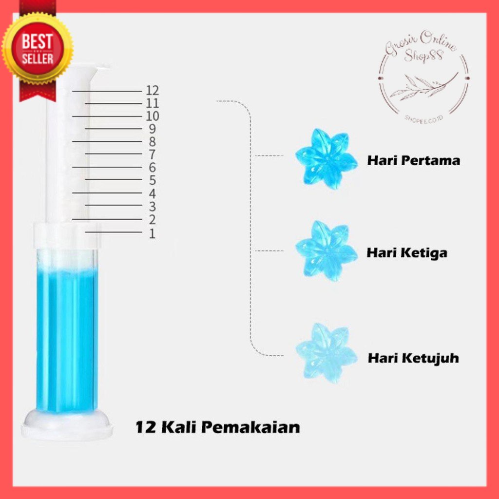 Fitur : - 12 Kali Penggunaan - Berbentuk Gel - Gampang di Aplikasi, Cukup ditekan di bagian kloset/toilet - 1 Suntikan Bisa Tahan Hingga 7 Hari (Tergantung Pemakaian) - Wangi Tahan Lama - Harga Terjangkau