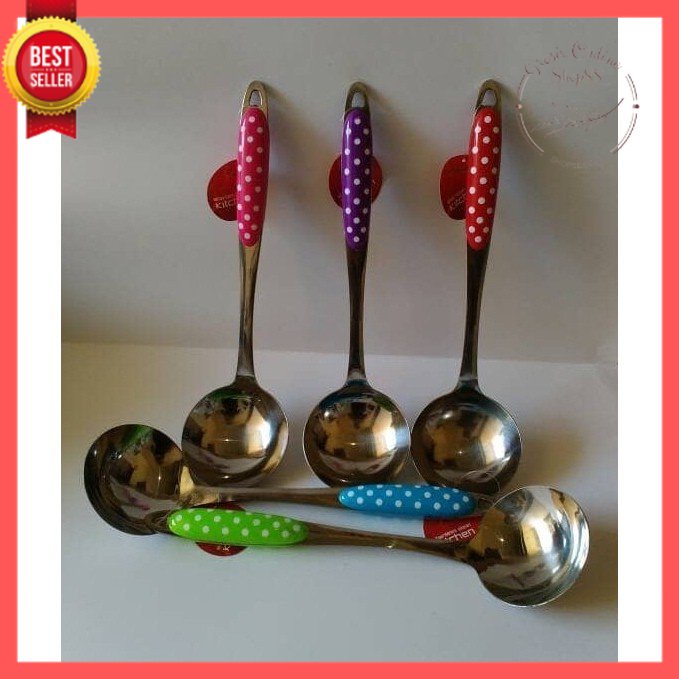 Sendok sayur polkadot didesain dengan penampilan menarik handle berwarna POLKADOT menjadikan sendok syur ini tampil cantik dan menarik sendok kuah berbahan stainless steel mengkilap sangat baik digunakan dimeja makan tampil cantik dan menarik