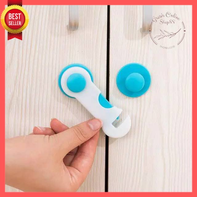 Kunci Pengaman untuk anak dan balita, agar tidak bisa membuka pintu, lemari, laci dan kulkas sendiri. Karena untuk membuka cantelannya harus dengan menekan warna bagian bawah sehingga tidak mudah bagi anak balita membukanya.