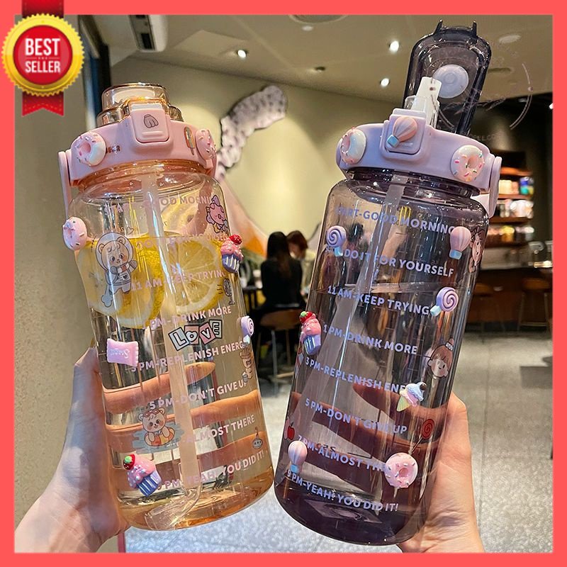 Botol 2L kekinian yang gemesh banget. Botol ini keren banget. Ada pembatas waktu kita minum. Dengan warna2 unyu yang transparant bikin kita jadi semangat pengen minum terus kan.. 😍