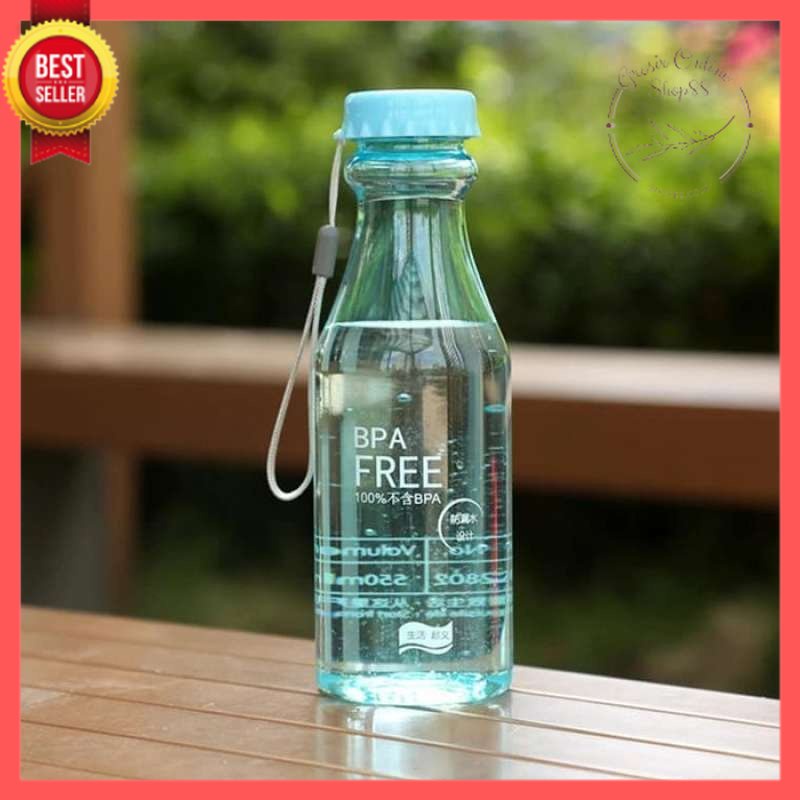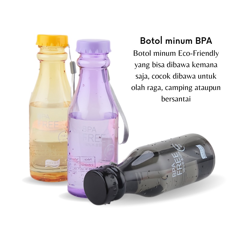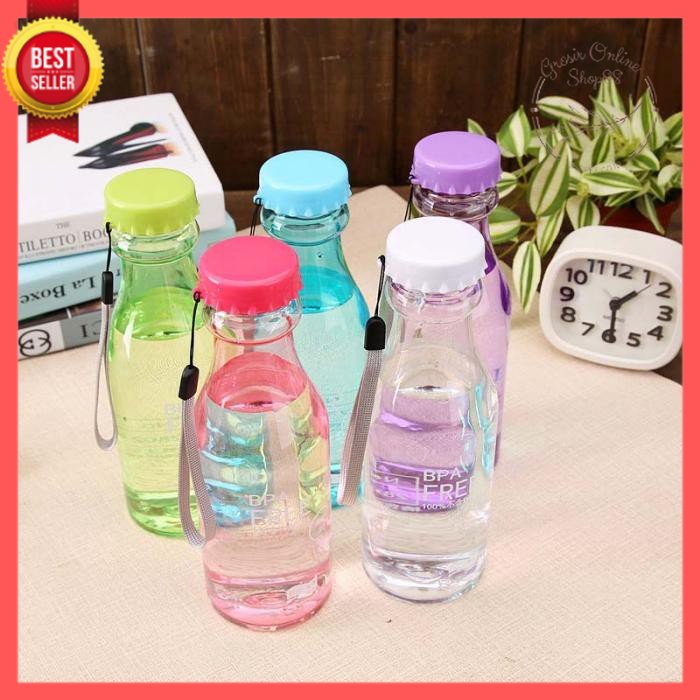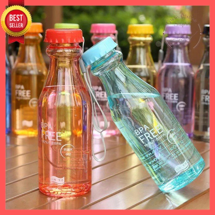 Botol minum unik, bentuknya mirip botol softdrink, trendy dan modern. Kapasitas 550 ml. Tutup botol ada lapisan karet anti tumpah. Dilengkapi tali, bisa ditenteng.