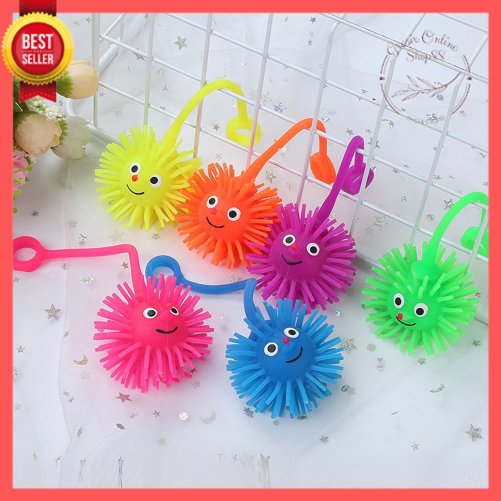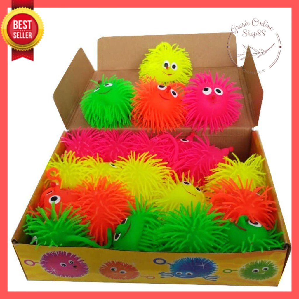 Mainan yoyo karet ubur2 motif pinokio / puffer ball terbuat dari karet yang lentur / elastis berduri , kenyal dan terdapat bola lampu di dalamnya , apabila terkena benturan akan menyala kelap kelip.