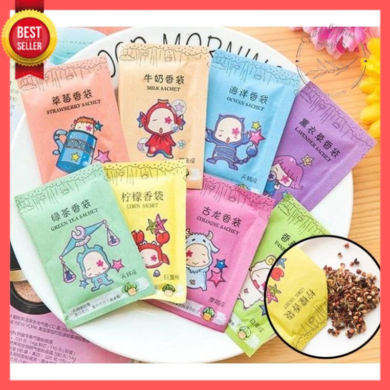 Fitur : - Tahan Lama - Ekomonis & Serbaguna - Desain sachet mini dengan bijian alami menghasilkan aroma lembut & soft - Bisa digunakan untuk pengharum ruangan, tas, dompet, pakaian, laci dll