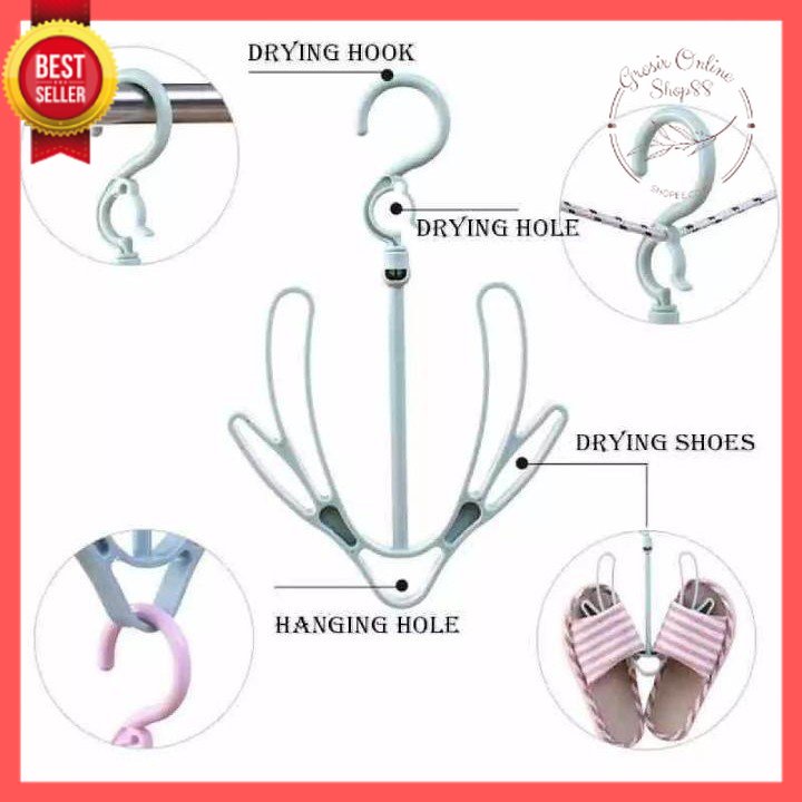 Gantungan praktis untuk sepatu dan sandal anda. Membantu Anda menggantung sepatu atau sandal anda. Bisa digunakan saat anda baru habis mencuci sepatu atau sandal anda, dan anda dapat menjemur sepatu atau sandal anda dengan menggunakan hanger ini.