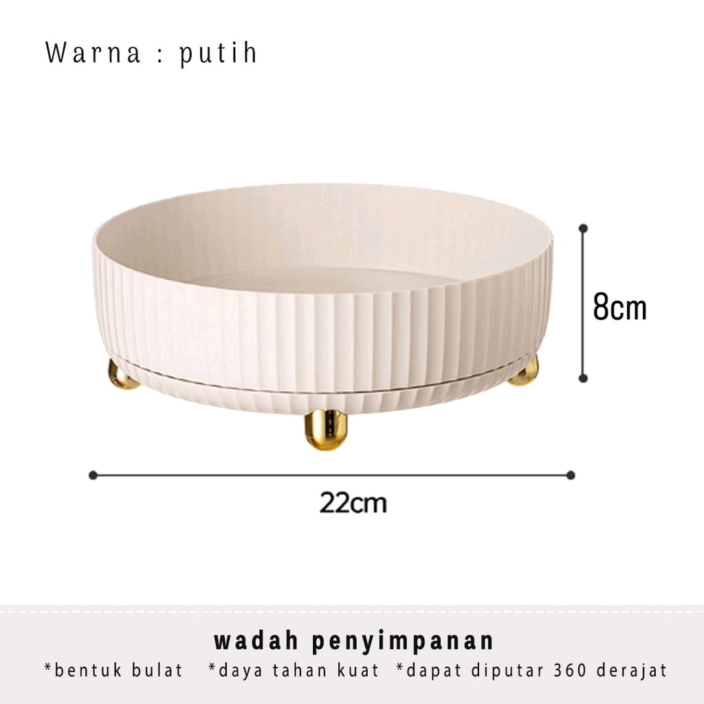 Keunggulan Produk : - Bahan plastik extra tebal, waterproof dan anti-bakteri - Bahan material ramah lingkungan, dan lebih tahan lama - Desain wadah storage bulat sehingga lebih spacious - Barang dapat dilihat dari segala sisi - Bisa digunakan di meja makan, ruang tamu, kamar tidur, lemari, kamar mandi dll - Serbaguna dapat digunakan sebagai wadah barang/bumbu/buah/kosmetik/snack dll - Wadah penyimpanan model putar 360 derajat, mudah akses - Mudah dibersihkan - Dipadu dengan warna vintage yang elegan menambah estetika ruangan