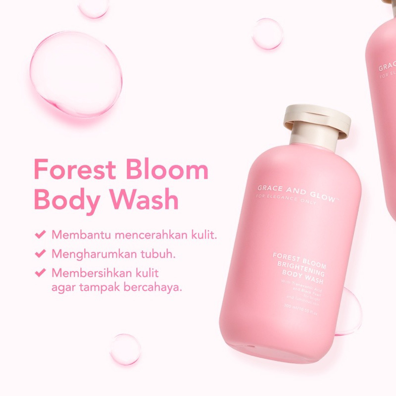 * Grace and Glow Forest Bloom Brightening Body Wash merupakan sabun mandi Memiliki 2 in 1 fungsi: Mencerahkan dan perawatan skin barrier yang menggunakan wangi spesial yang di develop langsung oleh Grace And Glow.